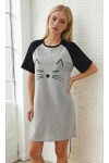 Kedi Surat Baskılı Kısa Kollu Gri Kadın Gecelik