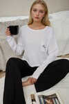Minimalist tarzıyla dikkat çeken bu pijama takımı, sade şıklığı ve konforu bir araya getiriyor. Üst kısmında göğüs cebi ve “love” yazısı bulunan beyaz uzun kollu tişört, modern bir dokunuş sunarken; alt kısmındaki siyah düz pijama pantolonu rahat kesimiyle hareket özgürlüğü sağlar. Yumuşak ve nefes alabilen kumaşı sayesinde hem uyku saatlerinde hem de evde keyifli vakitlerde ideal bir kullanım sunar.