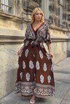 Etnik desenleri ve göz alıcı kahverengi tonuyla öne çıkan bu V yaka maxi elbise, hem rahat hem de şık bir duruş sunuyor. Bel kısmındaki kuşak detayı, vücut hatlarını zarifçe vurgularken, hafif kumaşıyla gün boyu konfor sağlıyor.