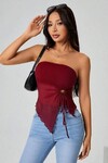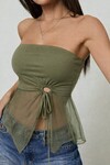 Haki Straplez Tül Detaylı Büzgülü Crop Bluz