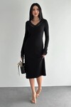 Kadın Dantel Detaylı V Yaka Elbise – Uzun Kollu Şık Günlük Elbise