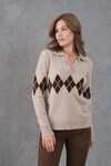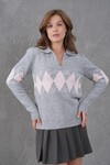 Kadın Polo Yaka Desenli Yarım Pat Triko Kazak