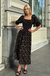 Kare Yaka Beli Gipeli Çiçek Desenli Elbise Mavi