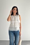Zarif ve feminen detaylarıyla öne çıkan ekru kat kat fırfırlı bluz, yaz kombinlerinizin vazgeçilmezi olacak! Hafif ve dökümlü yapısı sayesinde gün boyu konfor sağlarken, şık tasarımıyla hem günlük hem özel kombinlerde rahatlıkla tercih edebilirsiniz.