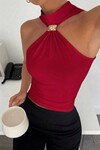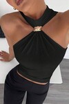 Siyah Halter Yaka Metal Detaylı Bluz – Şık ve Vücuda Oturan Tasarım